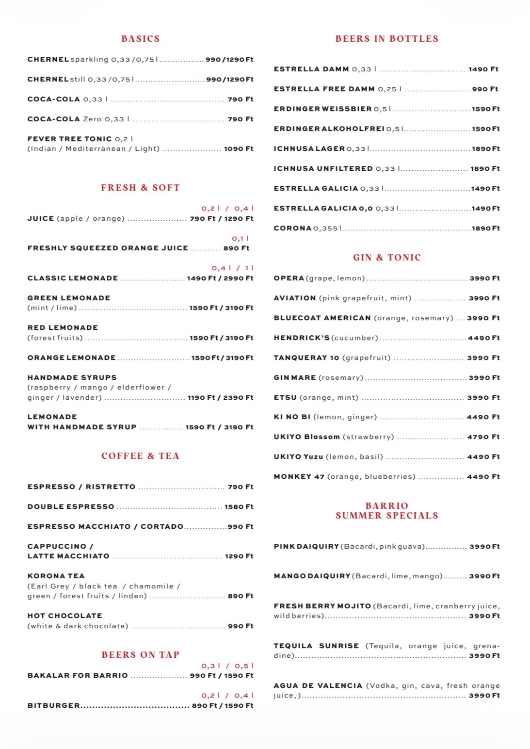 Nagyon büszkék vagyunk a borlapunkra, tartunk tízféle champagne-t, belépő- és csúcskategóriában is méltányosan árazva. Cavák, malbecek és carménérek alkotják a kínálat gerincét, de van egy különleges baszk fehérborunk, friss, üde, saját szénsavas bor, ami kifejezetten népszerű. Vannak persze hazai tételek is, és tizenháromféle gin sorakozik a polcon, a bártender mindegyikhez külön receptúra szerint alkot gin-tonikokat. Sörcsapon Ferran Adrià kedvence, az Estrella Damm, és a cseh Bakalár söre.